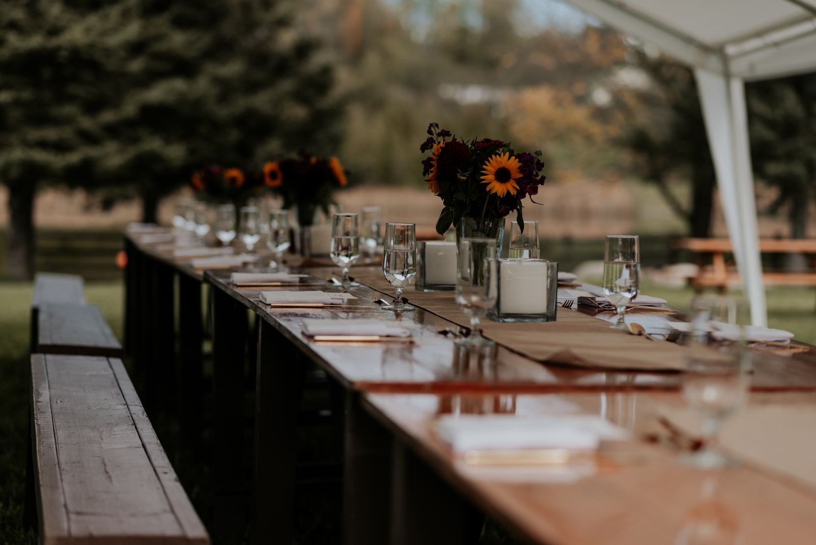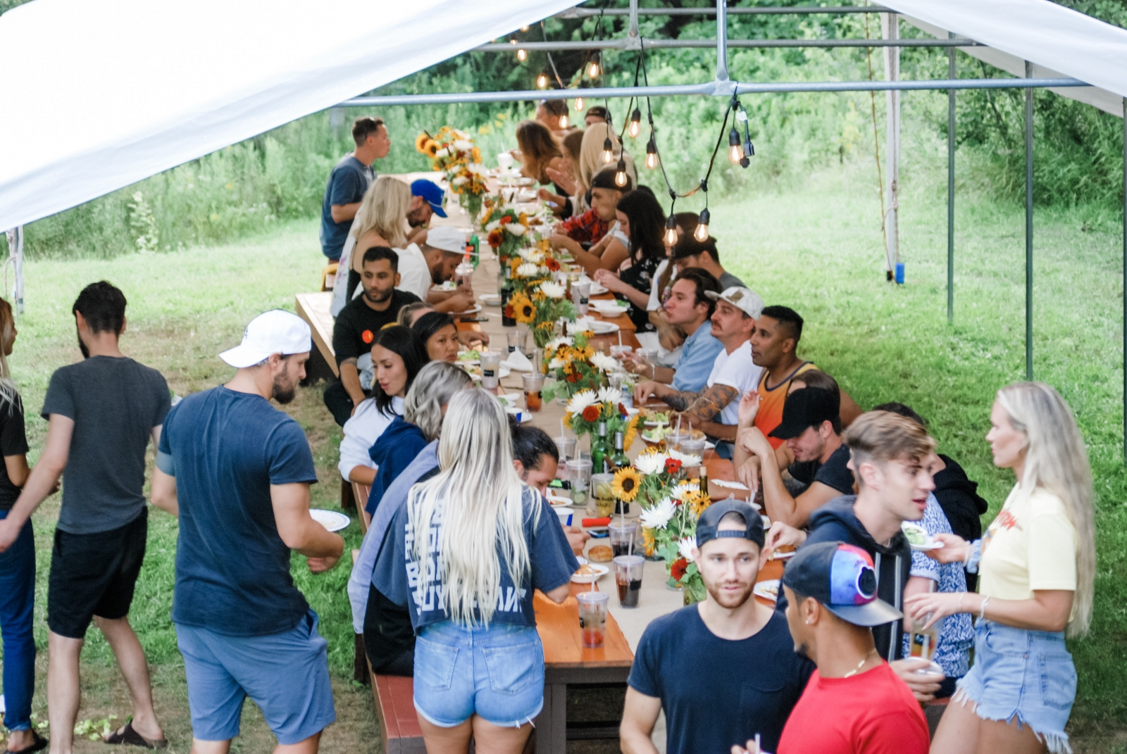 The Hollows has an large Dining canopy adjacent to the Camp Building and Wash-house. Illuminated with string Edison lighting, this lovely tented space provides guests with scenic vistas overlooking the lake and apple orchard. Dine at beautifully constructed custom-built harvest tables in an airy outdoor space.